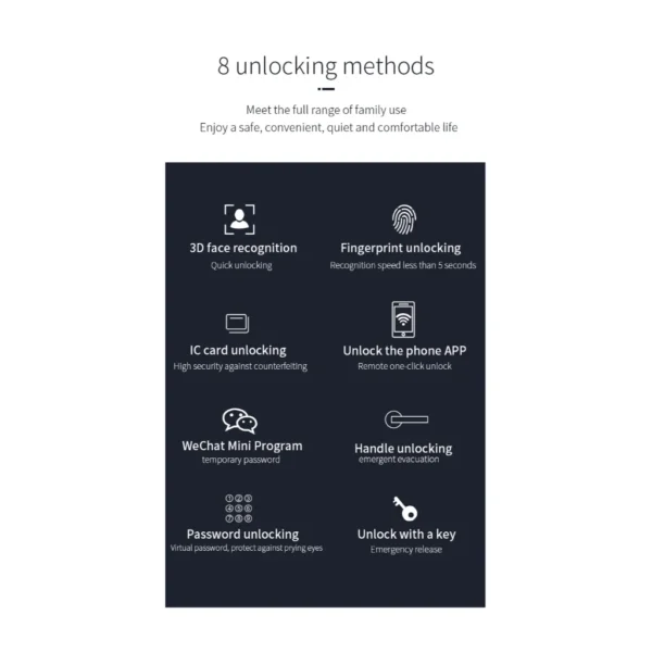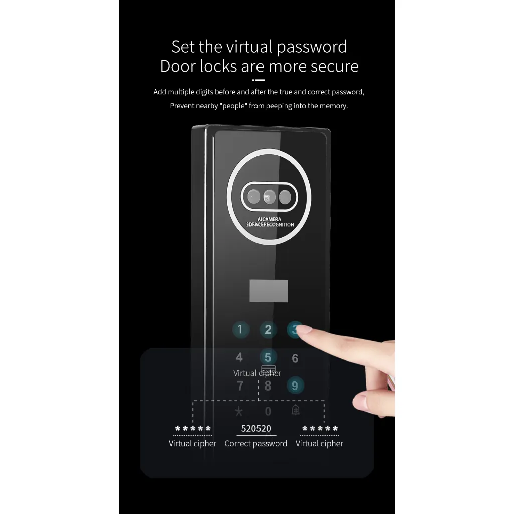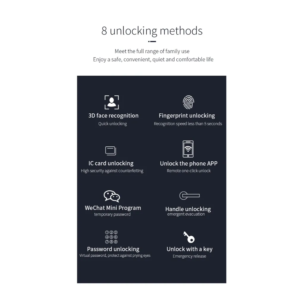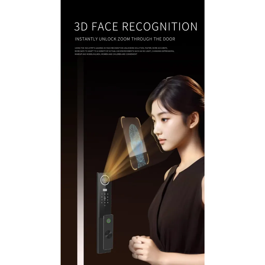 Install the modern way of access control ever built for luxury smart homes. The NiceSmart Q6 Smart Door Lock is a next-gen solution combining facial recognition, real-time video calls, app-based access control, wifi and many more. Designed for modern houses, this lock offers endless convenience, robust safety, and futuristic control, making an exception for high class families, apartments, and villas.